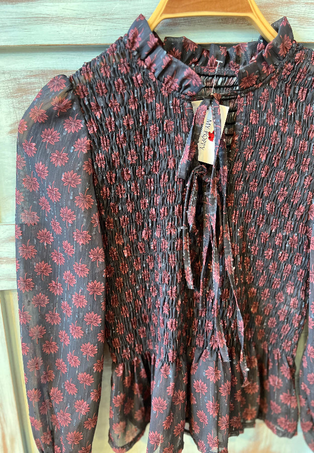 Blusa de gasa estampada en tonos turquesa y marrón.