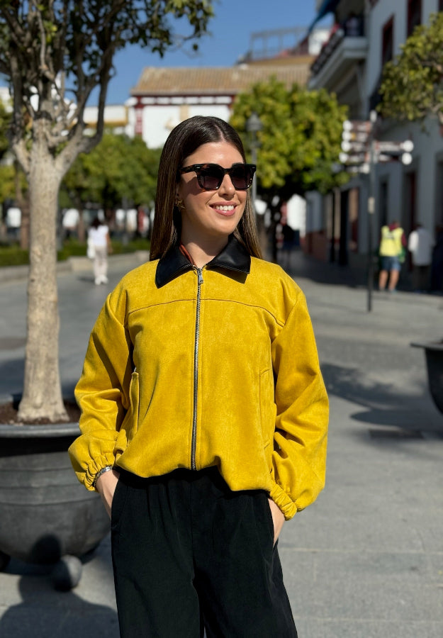 Bomber amarilla tela piel de melocotón y cuello de cuero negro.