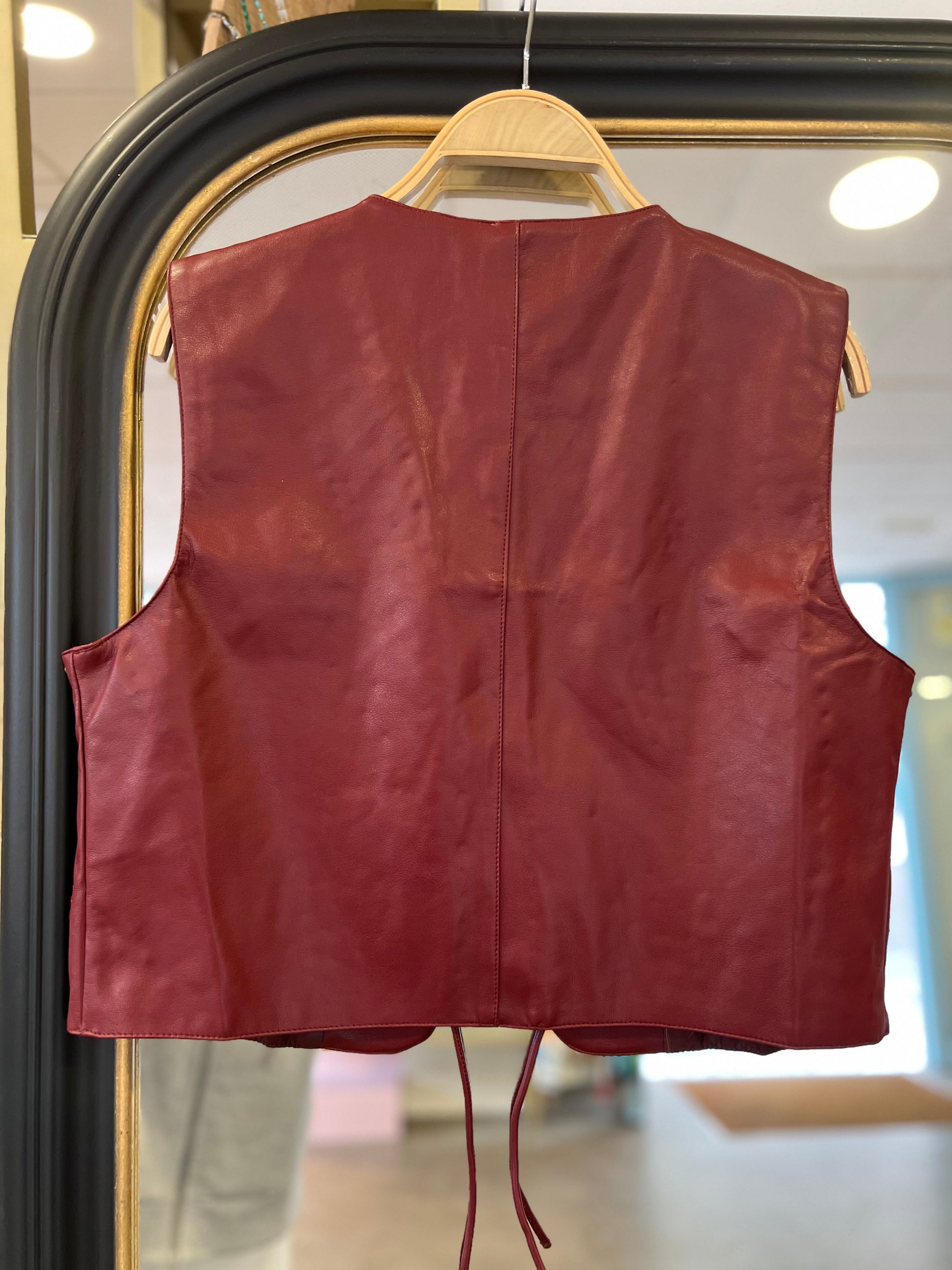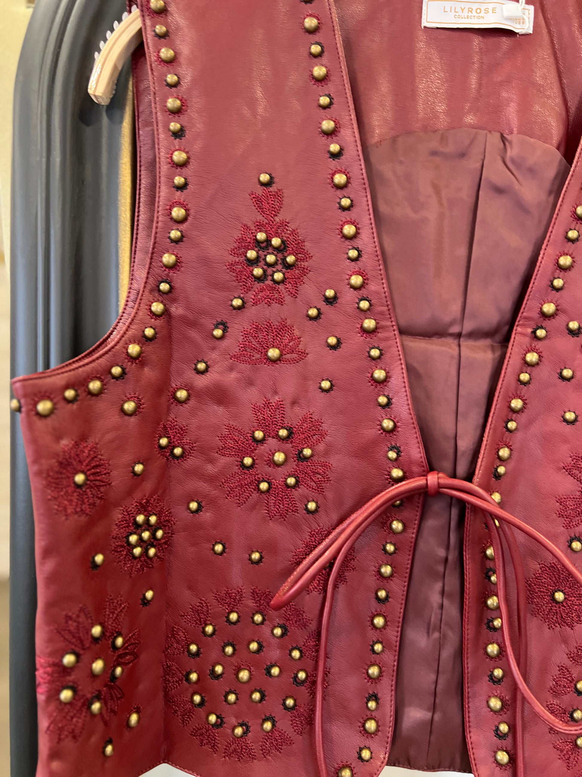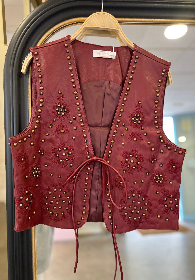 Chaleco de cuero bordado con tallas en color burdeos.