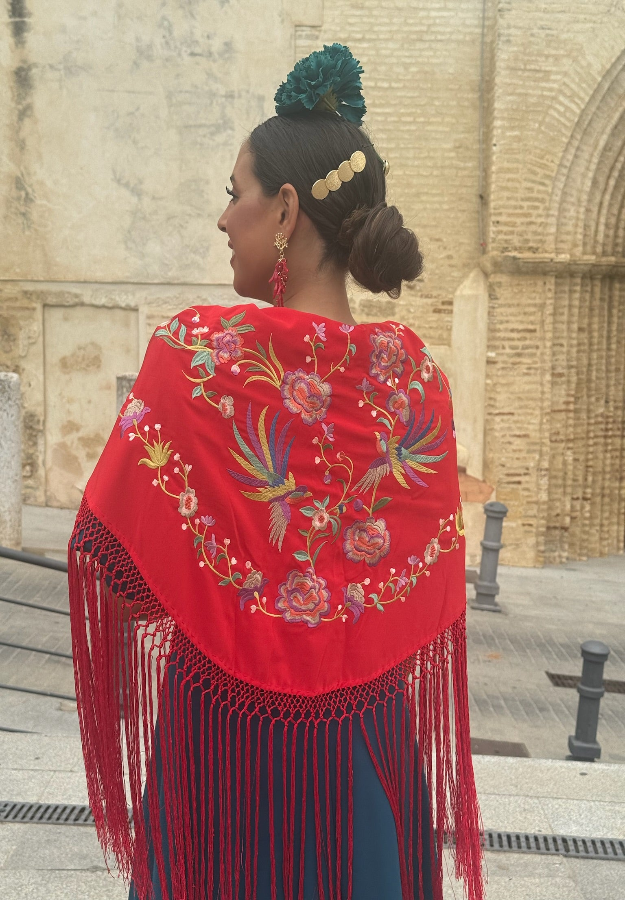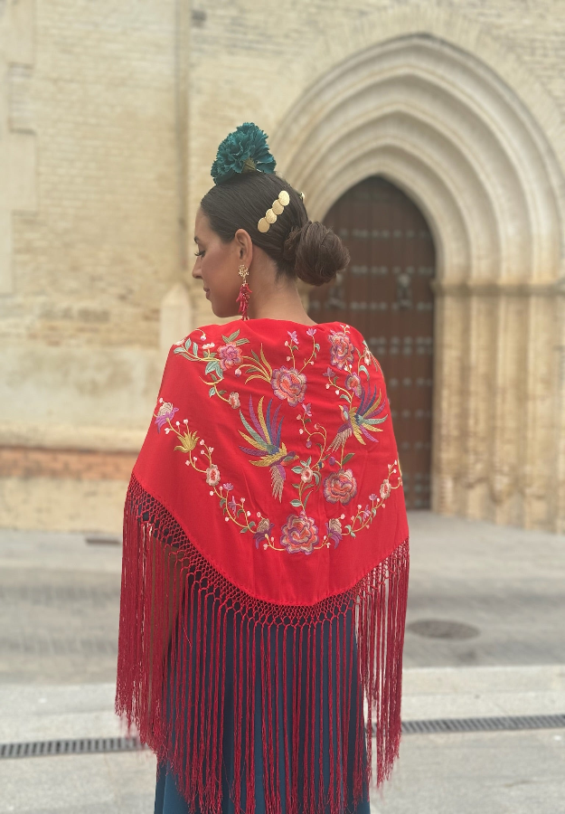 Mantón Pájaros Fondo Rojo