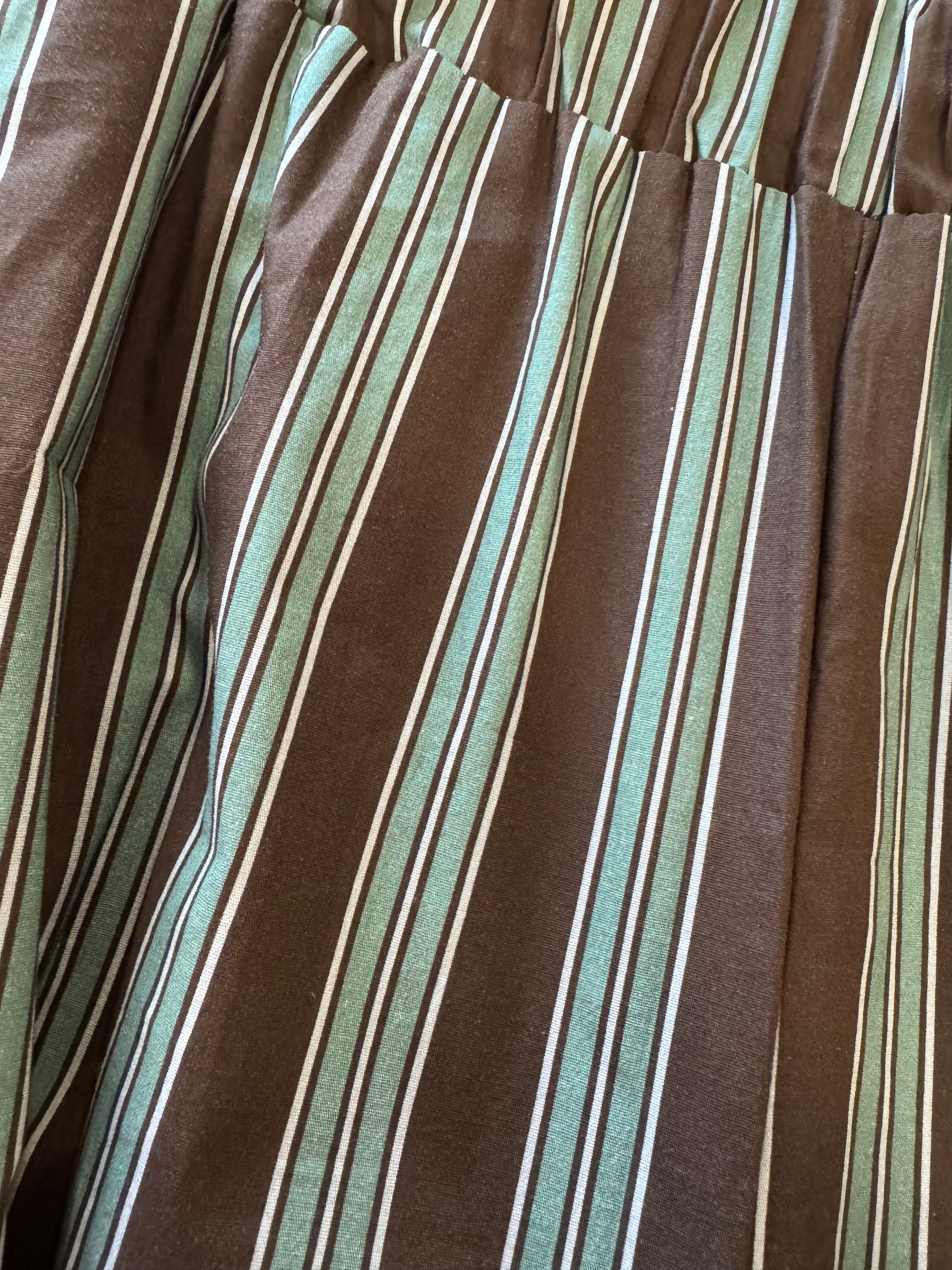 Pantalón bombacho estampado en tonos marrón y turquesa.